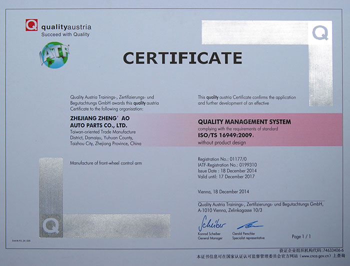 ZHEJIANG ZHENG'AO AUTO PARTS CO.,LTD was found in 1998.Equipped with more than 200 sets of 1600、1000T、630T、300T of friction press、XJ-1250 profile extruder、Hydraulic press、CNC、NC、milling machines、Control arm assembly test-bed、Three-dimensional measuring machine、Magnetic Testing、Salt spraying tester、Metallographic Instrument、Projection Instrument、Hardness machine、tension tester、Optical Spectrum Analyzers、Layer thickness meter etc.